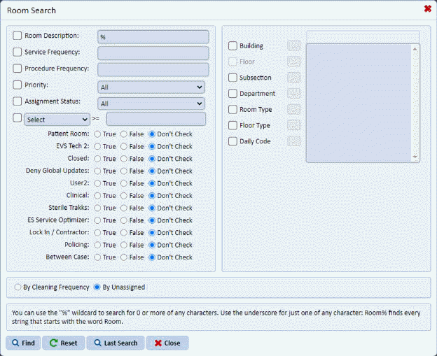 6. Specify the criteria for the rooms that you want to include in the assignment. Choose the building/floor, subsection, room type, etc. that you want to include in the assignment. You can specify based on the cleaning frequency or based on whether the rooms are unassigned.