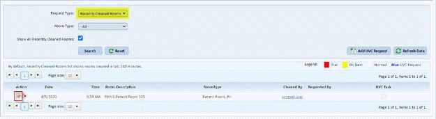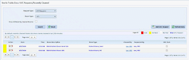 The room will automatically be changed from a recently cleaned room to a UVC Request for the same room as shown below: