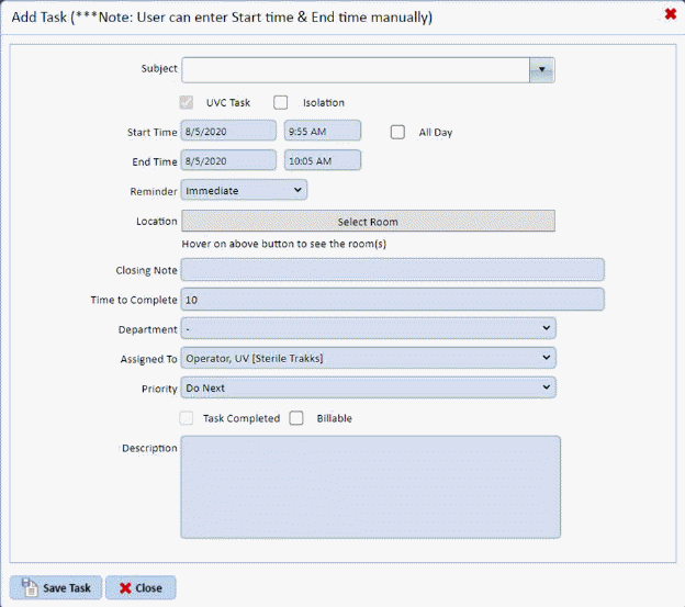 There are two ways to add a uvc request: First the user may edit an existing recently cleaned room thus creating a UVC Request, OR the User may use the Add UVC Request button to create a new UVC Request.