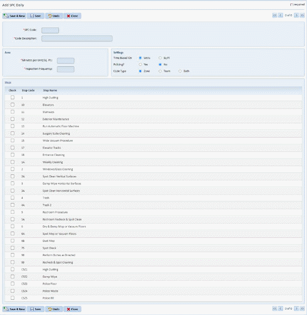 3. Enter all the necessary information for the new Daily SPC Code in the empty fields. Check the Cleaning Steps associated with the new SPC Code.