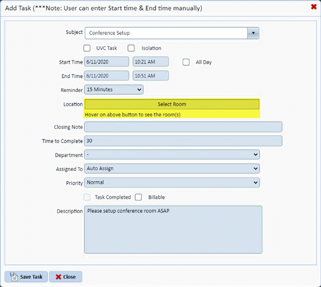 Users can also specify locations/room(s) with the Select Room button. This is applicable if the location/room in question is within the facility.