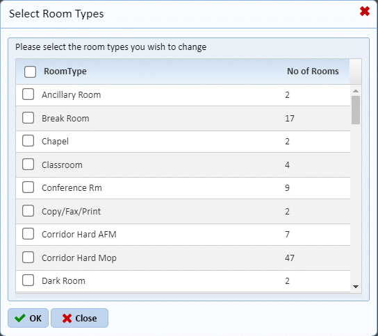 Notice how the rooms types are listed and show the number of associated rooms that use such a room type. Select one or more Room Types by clicking on the check boxes before the Room Type.