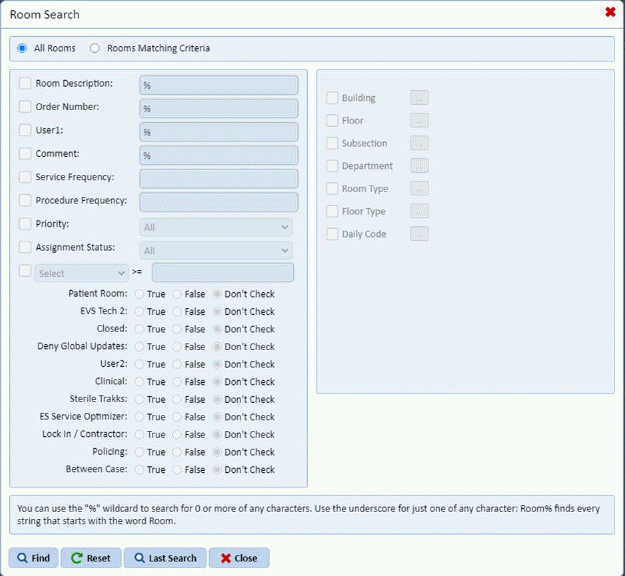 Specify criteria for the rooms to update. Click on the Find button