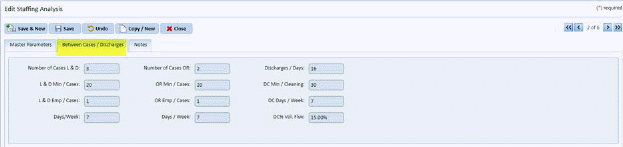 The Between Case / Discharges Tab contain the set of data for hospitals: L&D (Labor & Delivery), OR (Operating Room), and DC (Discharges). You must enter the information in the fields provided.