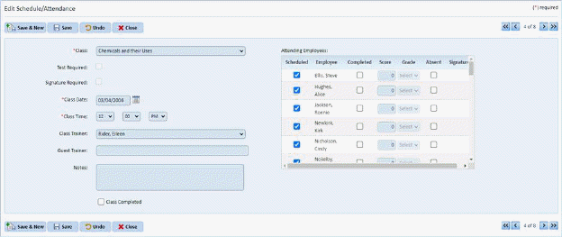 5. Check the Scheduled box for each employee who attended the class. If test required is checked enter the score the employee received, set Pass/Fail or Absent if they did not attend.