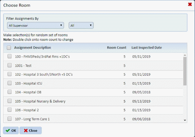 In this dialog box, the user can set the criteria with the Supervisors drop down list and whether the assignments are Open, Closed, or All. The supervisor criterion setting shows only those assignments a supervisor handles. The rooms are selected from any of the assignments themselves. The user can select the assignments with the rooms he wants included in the inspection.