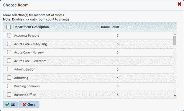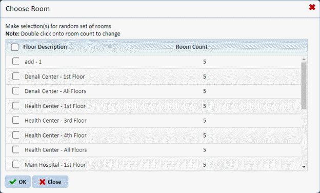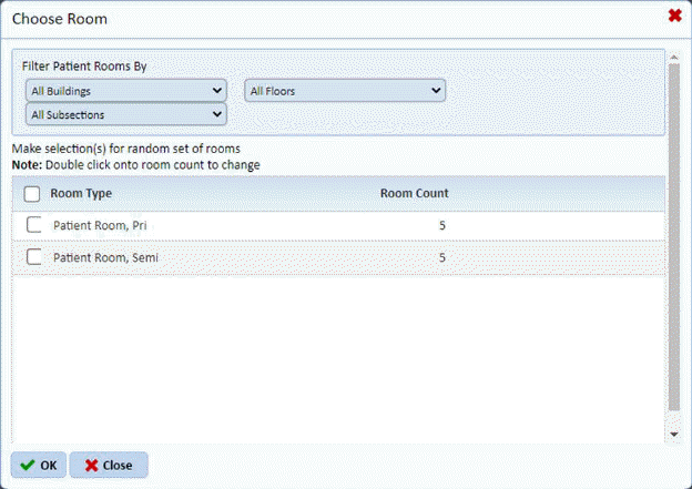Similar to the previous dialog box, the user can set the criteria for where the patient rooms may be located using the Buildings, Floors, and Subsections fields. The Buildings/Floors/Subsections field criteria setting show only those patient rooms that are available in the selected building/floor/subsection. The user selects the patient room types that have rooms fulfilling all specified criteria to include in an inspection.