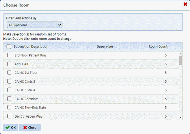 In this dialog box, the user can set the criteria with the Supervisors drop down list. The supervisor criterion setting shows only those subsections that a supervisor handles. The rooms are selected from the subsections. The user selects the subsections with the rooms to include in an inspection.