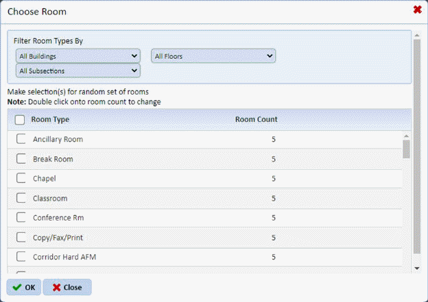 In this dialog box, the user can set the criteria for where the rooms may be located using the Buildings, Floors, and Subsections fields. The Buildings/Floors/Subsections field criteria setting show only those room types that are available in the selected building/floor/subsection. The user selects the room types that have rooms fulfilling all specified criteria to include in an inspection.