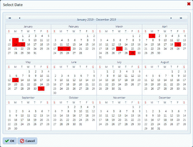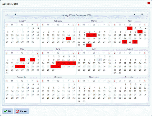 9. If you are content with your dates, click on the OK button. Otherwise click on the Cancel button. Canceling the date selection will require you to re-do steps 8 and 9.