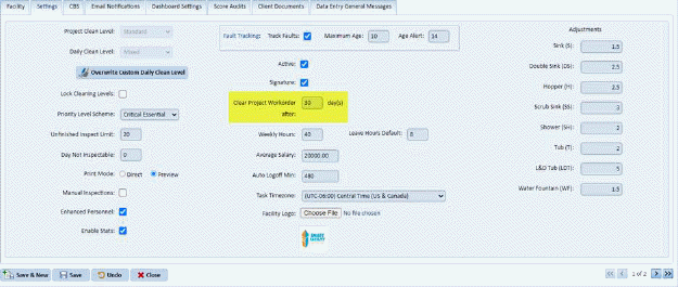 NOTE: By design, work orders are tasks that should be expedited when time is available. ES Optimizer has a default setting that helps the user to manage the open work orders whereby if a Work Order exceeded 30 days, the system would clear the work order. That setting can be changed in the Facility Form under the Settings Tab as shown in the figure below: