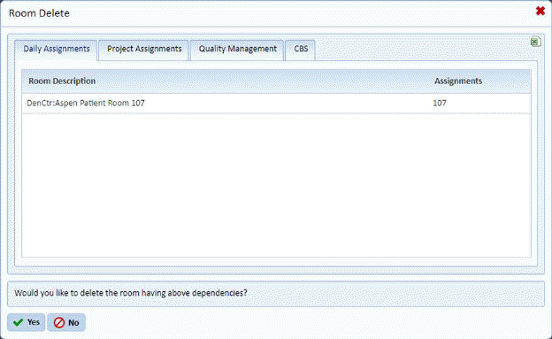 If the room has been linked to other modules you may see the dialogue box below which allows you to review the modules the room is attached to such as Daily Assignments, Project Assignments, Quality Management inspections, and or Census Based Scheduling: