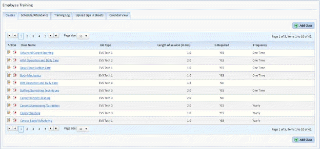This section deals with the Classes Tab of the Employee Training Module. The Classes Tab contains a collection of pre-defined classes and allows the user to create, edit, or delete classes when necessary.