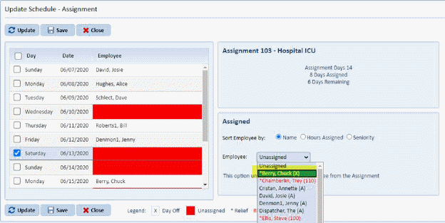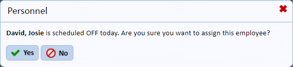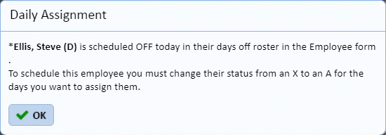 Notice the legend contains a Day Off Indicator now and that displays for every employee as you select that day so you are aware of their day off and wouldn’t accidentally schedule them that day. In fact the system goes a step further and asks you to update their day off if you wish to schedule them as shown below: