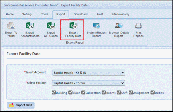 • By default, all the elements are selected (Building, Floor, Subsection, Rooms, Assignment and Duties).