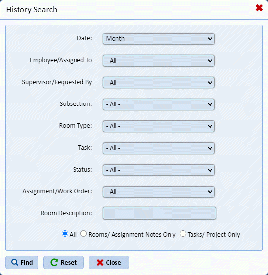 The History Tab shows a list of assignment duties, the employees, supervisors, the tasks involved and their priority level, as well as duration, dates and times for starting and completion.