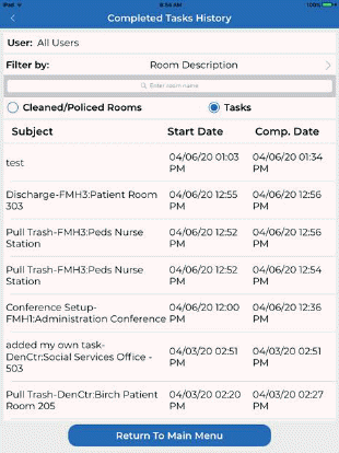 View History – This button opens the Cleaned/Policed Rooms so supervisors can view rooms and tasks employees have completed