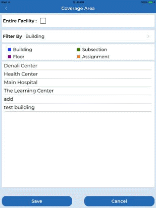 Unchecking Entire Facility (if selected) and tapping the “Filter By” bar allows the user to changes the area of responsibility. “Save” applies any changes made.