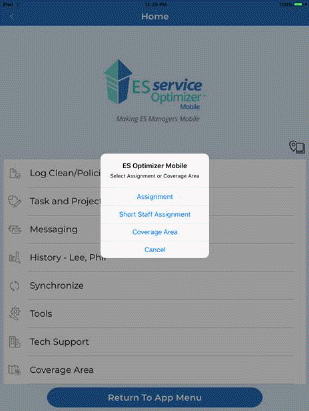 When users (supervisors) successfully log in to ES Service Optimizer Mobile, they will be asked to select the facility (if multiple facilities exist) above left, upon selection the user will be prompted to select an Assignment, Short Staff Assignment, and/or a coverage area as shown above right. The supervisor may make the appropriate selection(s) or Cancel and the Home Menu screen will display as shown below left. The Home Menu screen has several buttons.