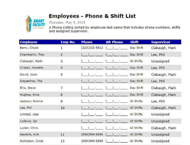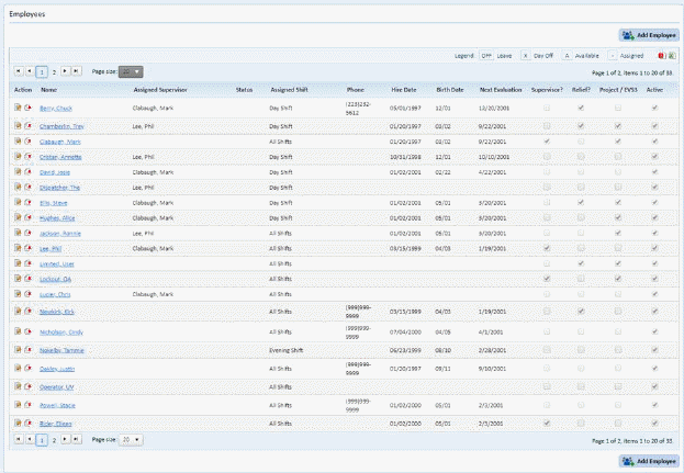 Lists show the current collection of data in the facility. They can be employees, rooms, dates, etc. Below is a sample of a list (of employees):