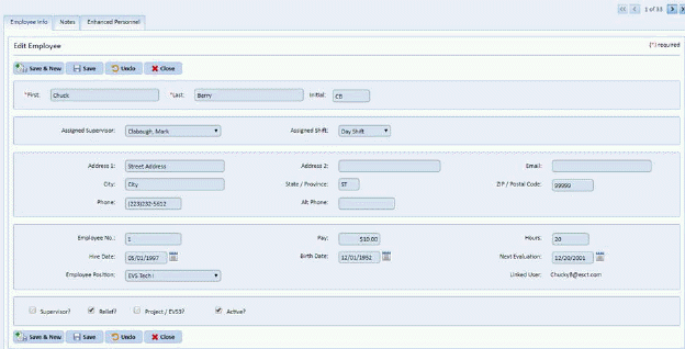 Forms are used for entering data. The data can be certain details about employees (phone numbers, addresses, etc.) or shifts (start times, break times, etc.). Below is a sample of a form: