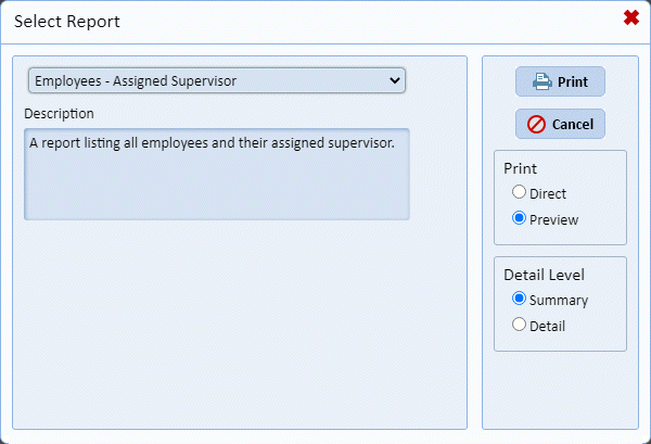 Reports are used for compiling the data from lists and forms into various formats like charts and graphs. Reports make data presentation more readable for the user. Below is a sample Print Report box: