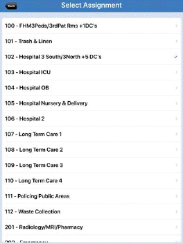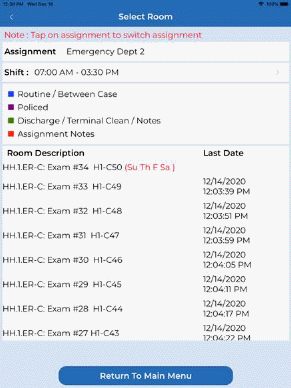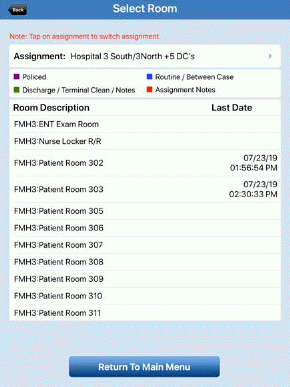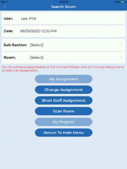 My Assignment – This button gives the user a list of rooms that are part of his/her employee work assignment. This is only applicable if the user has an assignment, below is a sample figure: