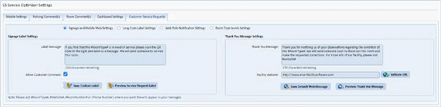 In Service Optimizer, Text Messaging abbreviates a room number to a long code which will create a Service Request. In Long Code Label Settings tab you can setup the defaults for Long Code labels and define the content of a Thank You Message the user will receive upon completion of the message they send much like the Signage and Mobile Web Settings section allows.