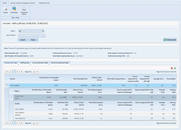 - Metrics menu shows rolling 30 days data of ES Optimizer Stats, Staffing Data and Survey Optimizer Stats in separate tabs.
