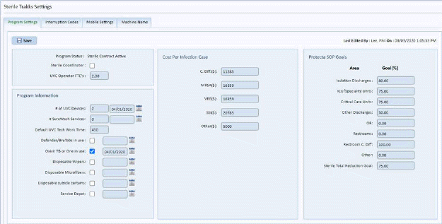 This tab allows the user to enter the various Sterile Trakks Program settings as it pertains to the facility.