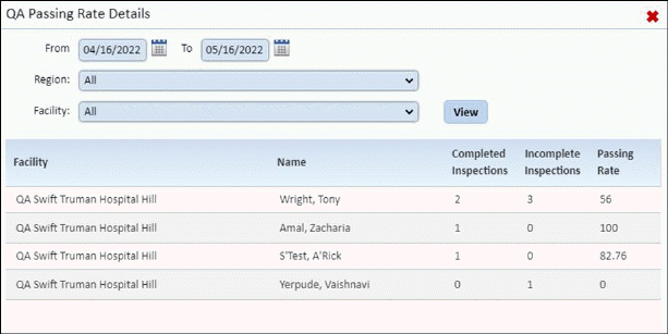 - By clicking the chart, more details are shown in popup with following fields: Facilty, Name, Completed Inspections, Incomplete Inspections, and Passing Rate.