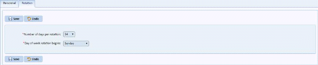 Rotation allows you to set the number of days and start day in a schedule period. The minimum days in a rotation starts at 7 days (1 week) and goes to 70 days (10 weeks). The rotation set affects the Personnel Module with its template and schedule. (See Personnel Module for more details.)