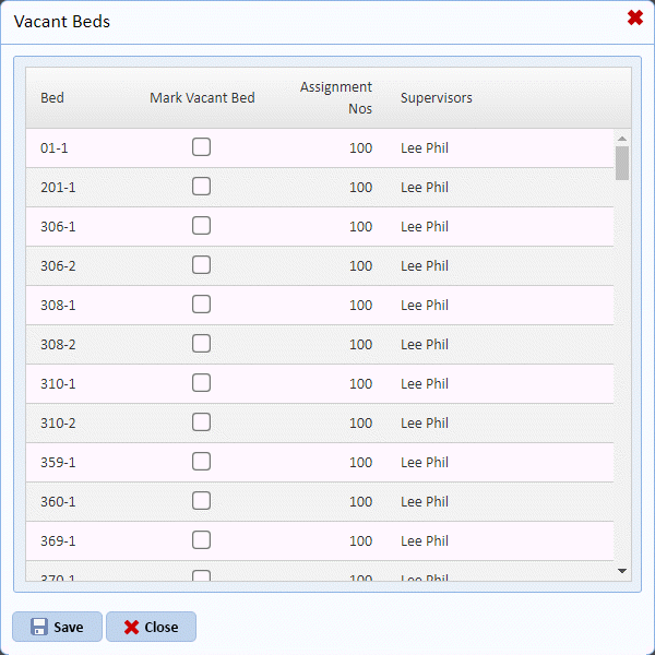 6. Check off the beds that are vacant. Click on the Save button when done.