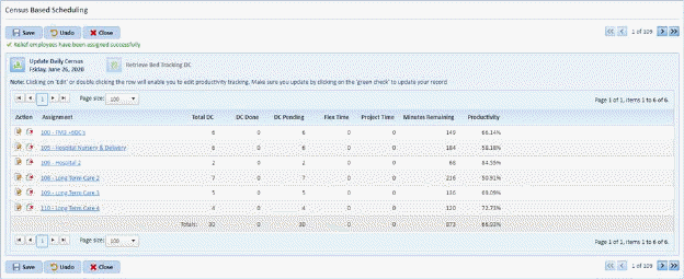 Management uses the Discharge Times and Quotas report. The Discharge Times and Quotas Report is a daily summary report that lists the assignments, the employees working those assignments that day, the optimum time, the required time, the remaining time, and the number of discharges (quotas) that the employee should be able to handle that day and still finish the other work in the schedule.