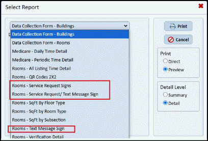 - Generated PDF report for “Rooms - Service Request Signs” report which generates PDF as per selected template settings.