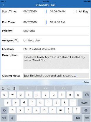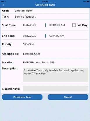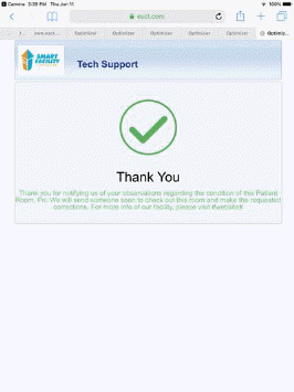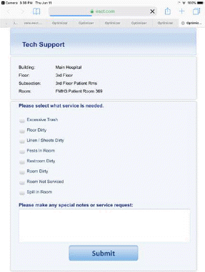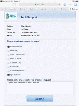 The Service Request System is a function that allows visitors/patients to request service for any room with their mobile device (smartphone or tablet) by scanning a QR code for the room and specifying what type of service is required. Alternately, user may use long code and text the room code and the issue to a toll free number to create a Service Request. The visitor/patient can enter comments and expect a facility environmental services employee to perform the service as necessary.
