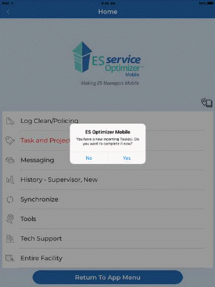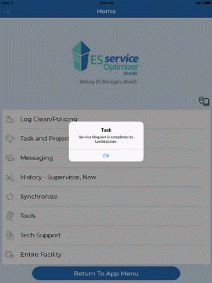 Depending upon the setup and the use of the decision engine a supervisor may get the Service Request and then assign it to a Service Optimizer Tech Mobile user (employee) or the request can go directly to the employee. Below is an example of the service request being received by a supervisor in ES Optimizer Mobile – Service Optimizer Module: