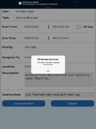 Finally, the supervisor can receive notification the service request has been completed as shown below: