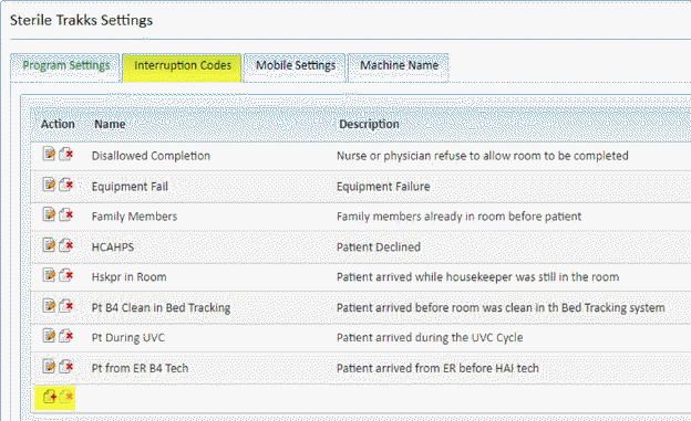 4. The next tab is the Interruption Codes tab. Most of the likely defaults will be entered here for you. If you wish to Edit, Add or Delete use the action buttons are available as usual.