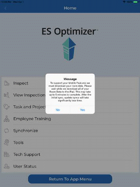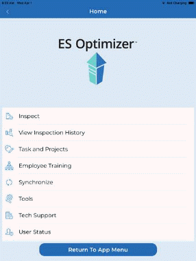 After finishing your inspection, you should synchronize as soon as possible with the ES Optimizer system to ensure your data is saved to the ES Optimizer web application.