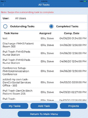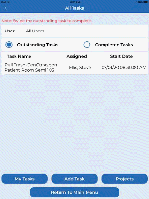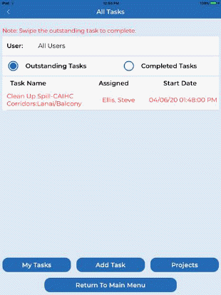 All Tasks - Users may also view All Tasks for all Users & Supervisors by tapping the All Tasks button. An example of the All Tasks “Outstanding Tasks” screen is shown below left, an example of the “Completed Tasks” screen is shown below right.