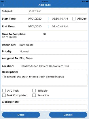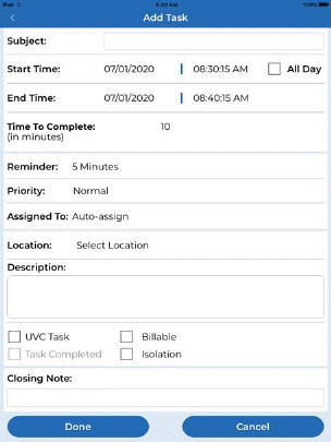 3. Enter the necessary information description, priority, assigned to or Auto Assign, location, description, UVC Task, Billable, Isolation as it applies to the new task.