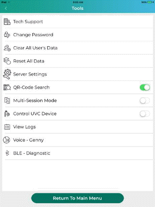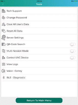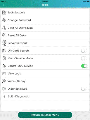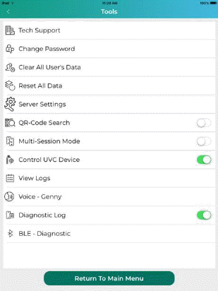 Control UVC Device – Diagnostic Log - Users can control the UVC device when using the standard disinfection controls within the application. User may also enable the Diagnostic Log function which will track device control via a log which can be provided to tech support. See the “View Logs” section for more information.
