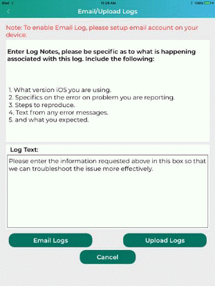 If Technical Support asks you to Upload\Email logs provide the information requested in the box shown and then tap the appropriate button.