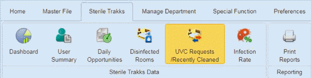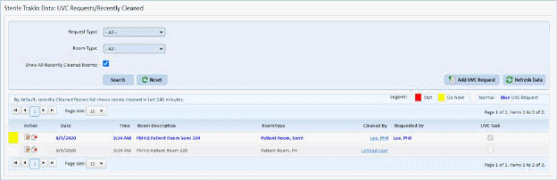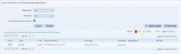 The UVC Requests/Recently Cleaned menu allows the user to view UVC Requests and/or Recently Cleaned rooms in the prior four hours. User may add a UVC request directly from this screen.